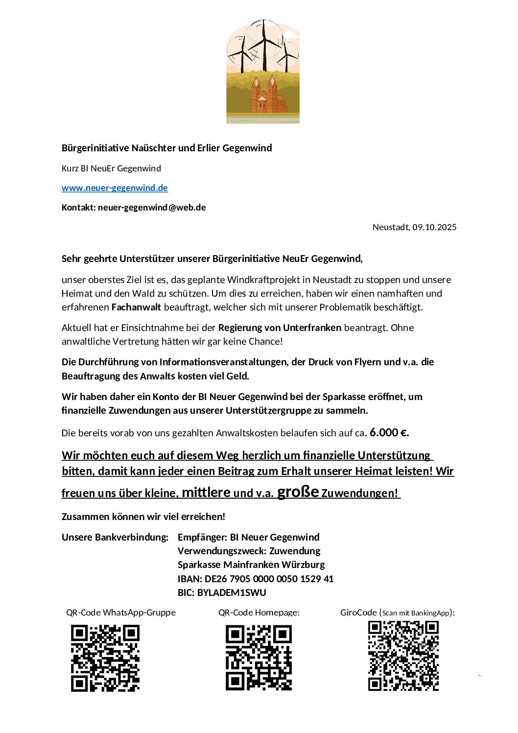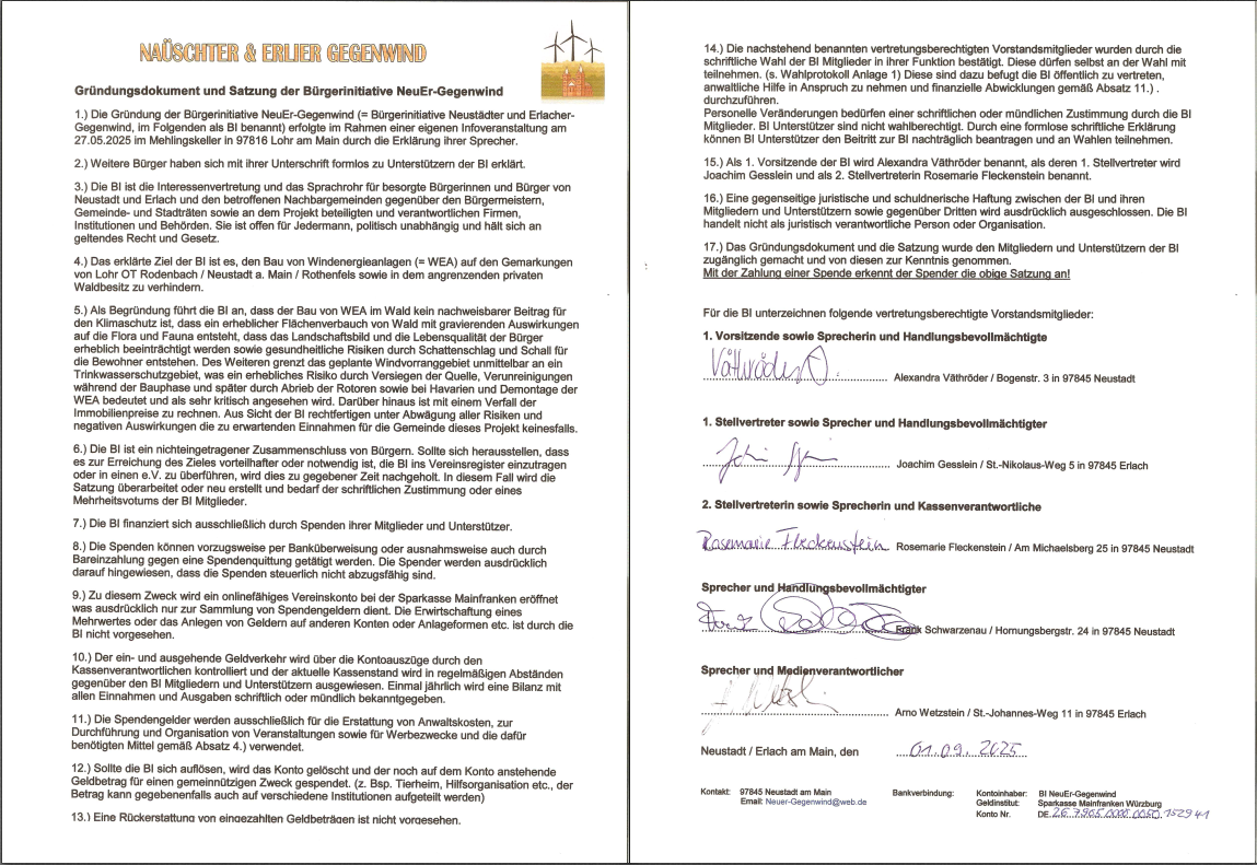 Im Gemeindewald von Neustadt a. Main sind ca. 6 Windkraftanlagen geplant und nach Aussage des BGM sind bereits Verträge mit der Energieversorgung unterzeichnet worden. Da die bindende und rechtskräftige Zusage für das Windvorranggebiet erst im November beschlossen...