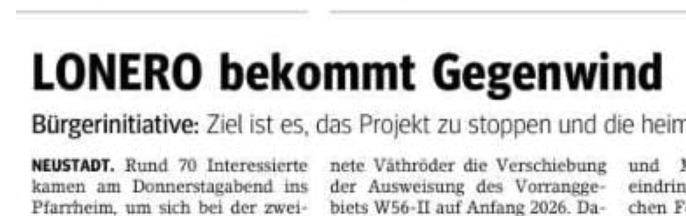 Zeitungsartikel: LONERO bekommt Gegenwind von Arno Wetzstein | Okt. 13, 2025 | Uncategorized | 0 Kommentare Artikel in Main-Echo am 13.10.25 zur Informationsveranstaltung vom 9.10. Kommentar absenden Antwort abbrechenDeine E-Mail-Adresse wird nicht veröffentlicht. Erforderliche Felder sind mit * markiertKommentar * Name * E-Mail-Adresse * Website Meinen Namen, meine E-Mail-Adresse und meine Website in diesem Browser für die nächste Kommentierung speichern.